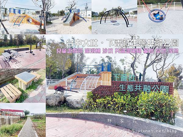 下番社生態共融公園位在台中大肚區,2019/10/22完工開放遊玩。這裡屬社區型公園,占地面積近600坪,有兒童遊戲場、體健設施、景觀生態、水道與綠地空間。