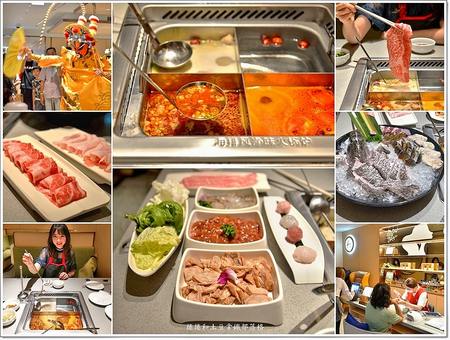 海底撈入口處貼心供應小餅乾、飲料與冰淇淋等小點心,在候位時可以先享用小點心,服務人員也會貼心供應茶水。火鍋有多種湯底可選擇,特別的是有四宮格鍋,讓你一次享用多種口味。點餐時建議點選一份撈麵,師傅會來到桌邊現場表演逗趣的拉麵秀,每天還會有川劇變臉秀,非常特別。
