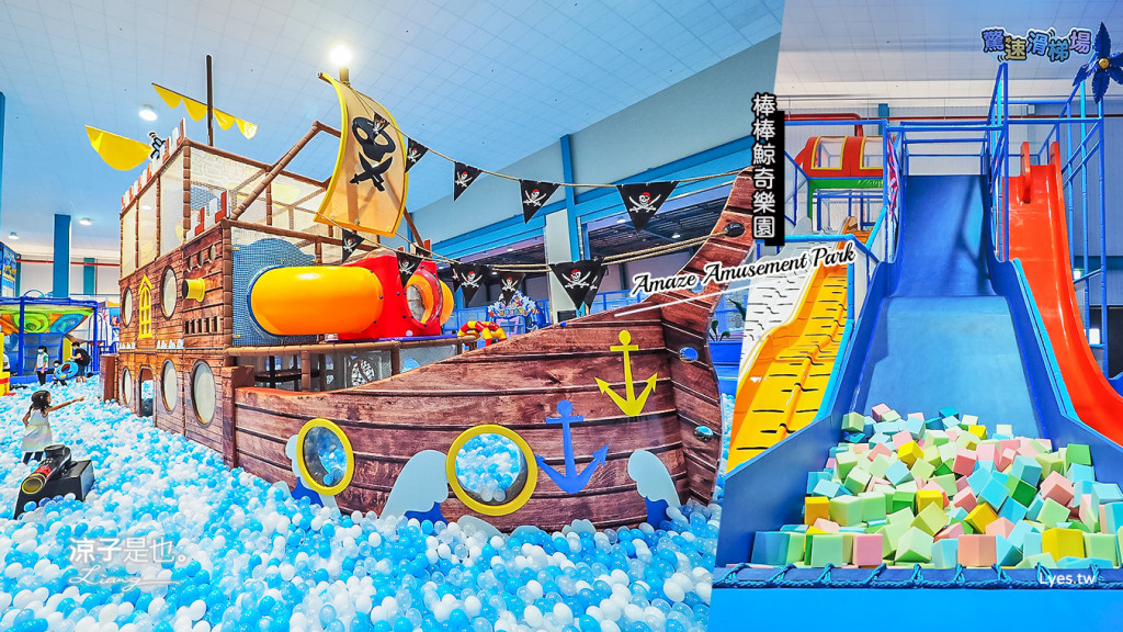 鯨奇海洋館適合3歲以上兒童遊玩,裡面又分為5大區域,有大型決明子沙坑、海盜船大球池、大波浪溜滑梯、魔鬼滑梯、滑草、繩網闖關、大型積木場等,且大部份都是動態設施,很適合電力滿滿的小朋友。