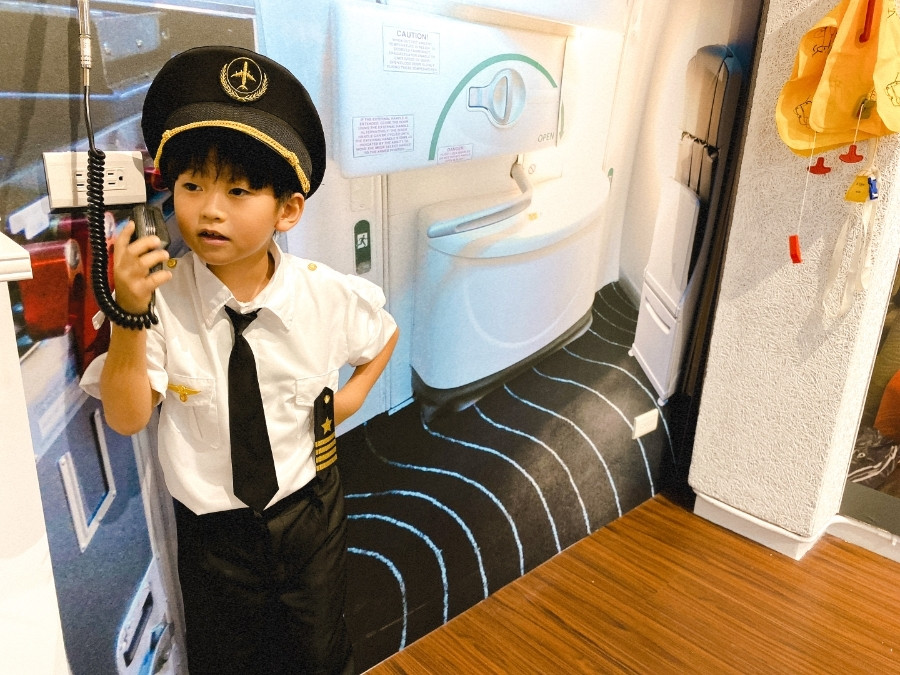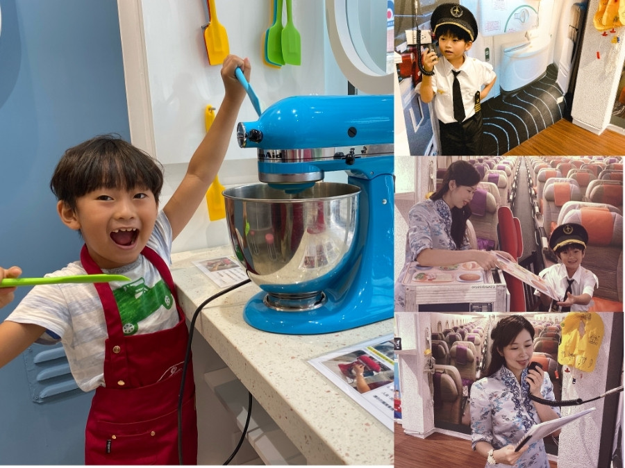 完成烘焙作品後,接著來到B1機艙模擬區換裝拍照趣,裡面提供不同航空公司制服,還有飛機、機艙、空中廚房等佈景,讓大家盡情拍照。報名烘焙DIY含一套空姐制服,試穿其它制服加購價200元。