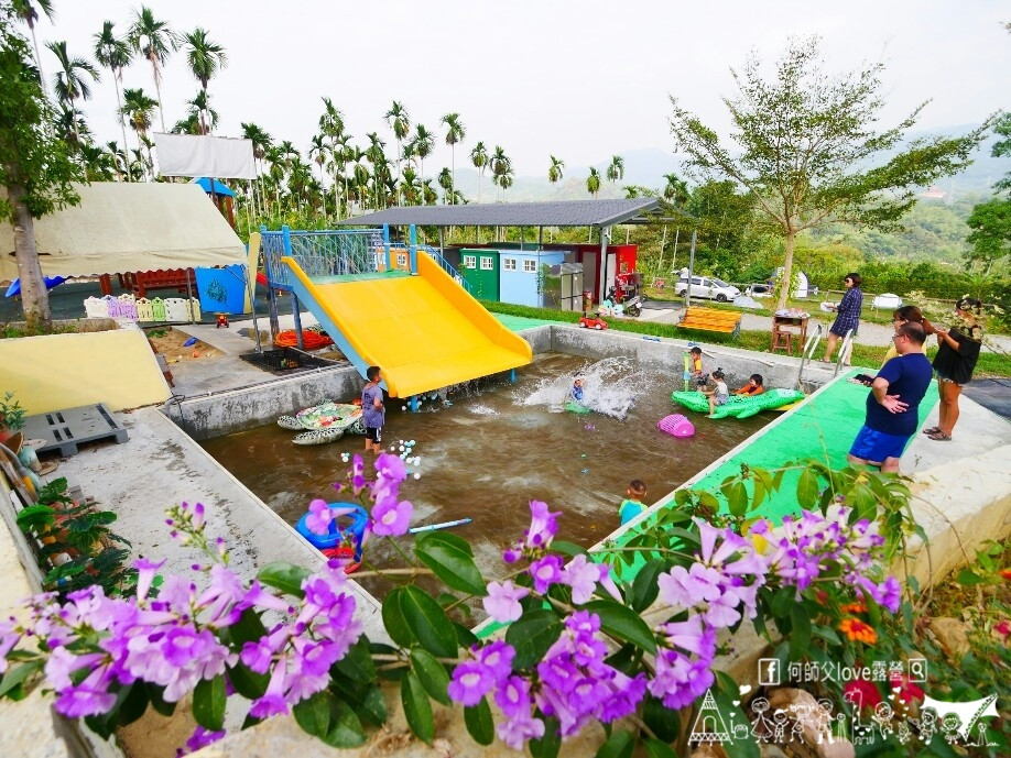 營地有專為小朋友打造的遊戲區,戲水池與滑水道是夏季最受歡迎的地方,一旁是雨棚戲沙區、塗鴉黑板、溜滑梯遊戲組、滑步車、草地滾大球等,還有室內遊戲室,裡面擺放積木、廚房組、圖書、玩偶等玩具,小朋友雨天也有的玩。