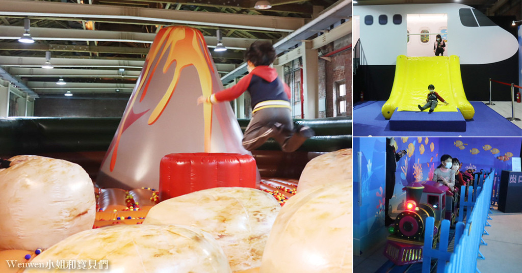 展場以火山、叢林、沼澤、山谷與海洋等生態場景,設計8個主題遊戲區,小朋友首先搭上怪怪島專機再滑下氣墊滑梯,並搭小火車進入怪怪島,就可以闖關遊玩,有趣的登島方式,讓小朋友超期待的。