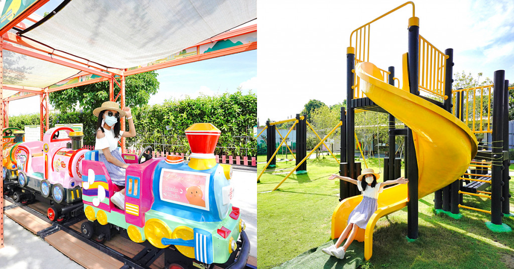 園區戶外有可愛的拍照造景與小庭園,庭園可以玩投幣式小火車、賓士卡丁車、槌球、跳格子、草籬迷宮、沙坑、戲水池、撈玩具魚等,還有盪鞦韆與溜滑梯草皮遊戲場,除投幣式小火車與卡丁車需另付費外,其它都可直接遊玩。