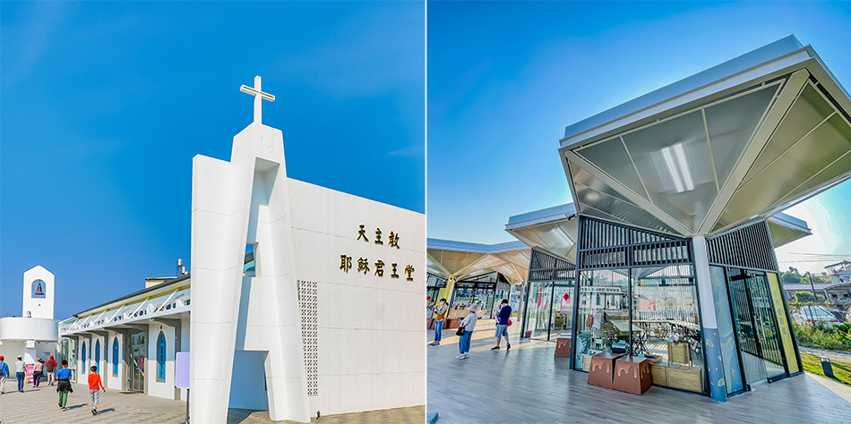 園區純白教堂吸引大家的注意,漂亮的藍色窗框與二樓的鐘樓很好拍照。戶外大草皮區設置野餐桌,草皮上還有幾顆大球給小朋友推著玩,整體環境既輕鬆又愜意,充滿南台灣的悠閒風情。