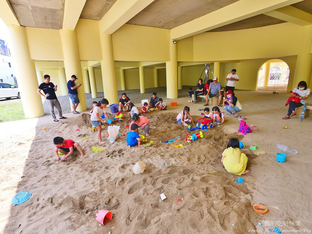 往內走有一座大型戲沙坑,沙坑就在農舍下,屬半室內空間,不會曬到太陽又通風,旁邊有休息座椅,天熱時適合讓小朋友在裡面玩沙。