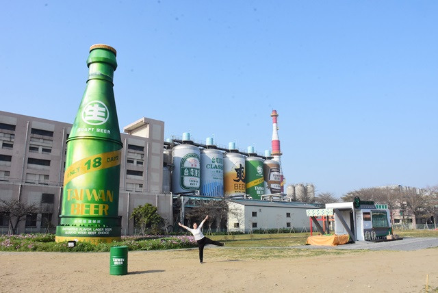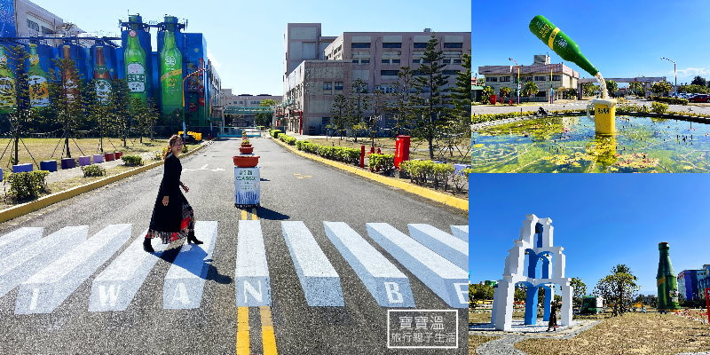 巨大啤酒罐是由舊煙囪與發酵桶重新上色而成,有5瓶啤酒罐與1瓶18天生啤酒瓶,站在啤酒瓶旁拍照,人變的好小,拍起來超逗趣的。另一邊則有漂在空中不停傾倒的啤酒瓶、3D斑馬線、啤酒籃金字塔、台啤小火車等。草皮區很適合跑跳,就帶小朋友來拍拍照遊玩趣。