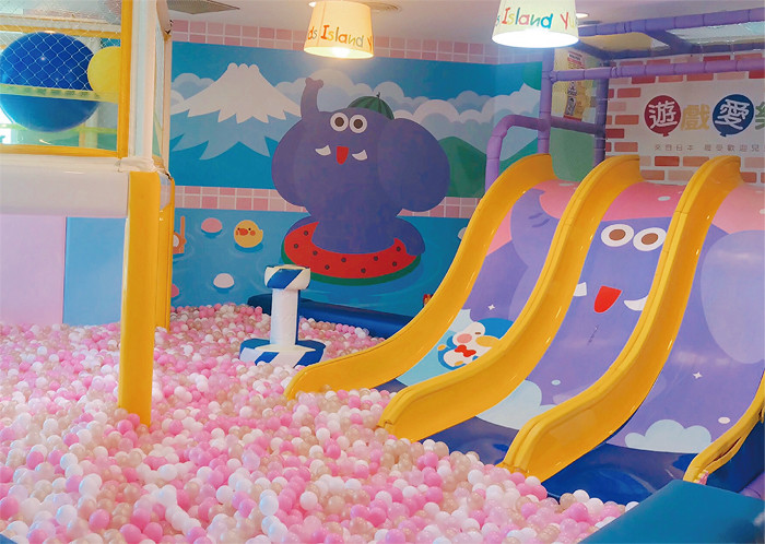 中壢大江店適合128公分以下兒童入場,裡面分為球池區、扮家家酒、氣球屋。粉色球池夢幻好拍照,溜滑梯上還有彩繪圖案,打造活潑熱鬧的氣氛。
