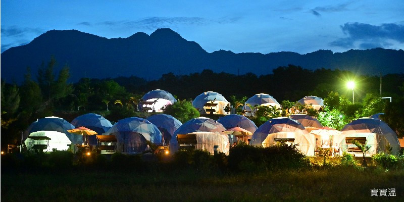 營地提供半圓形的星球帳,帳內挑高且寬敞,配置雙人床2張、電視、冷氣、電風扇、小沙發、獨立衛浴,戶外有搖椅及烤肉桌,若是入住上層營位,還可遠眺大海風景。