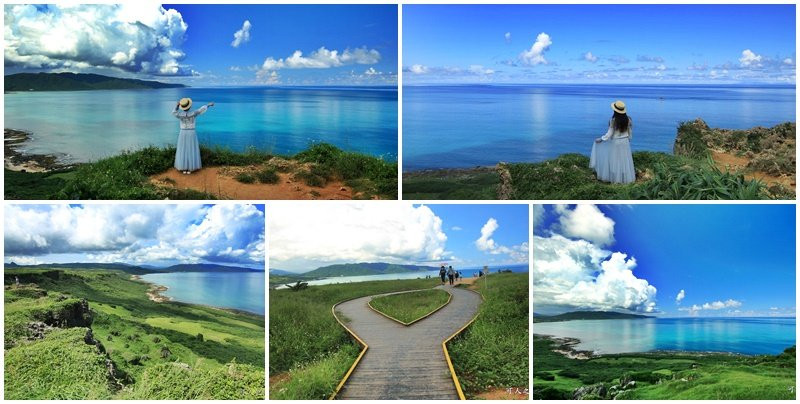 從入口處沿著木棧道走,不用很久就能看到漂亮的風景。步道的二側是廣闊的草原風景,到了盡頭則是紅土以及崩崖地形,前方大海淺深交錯出的漸層藍真是迷人。
