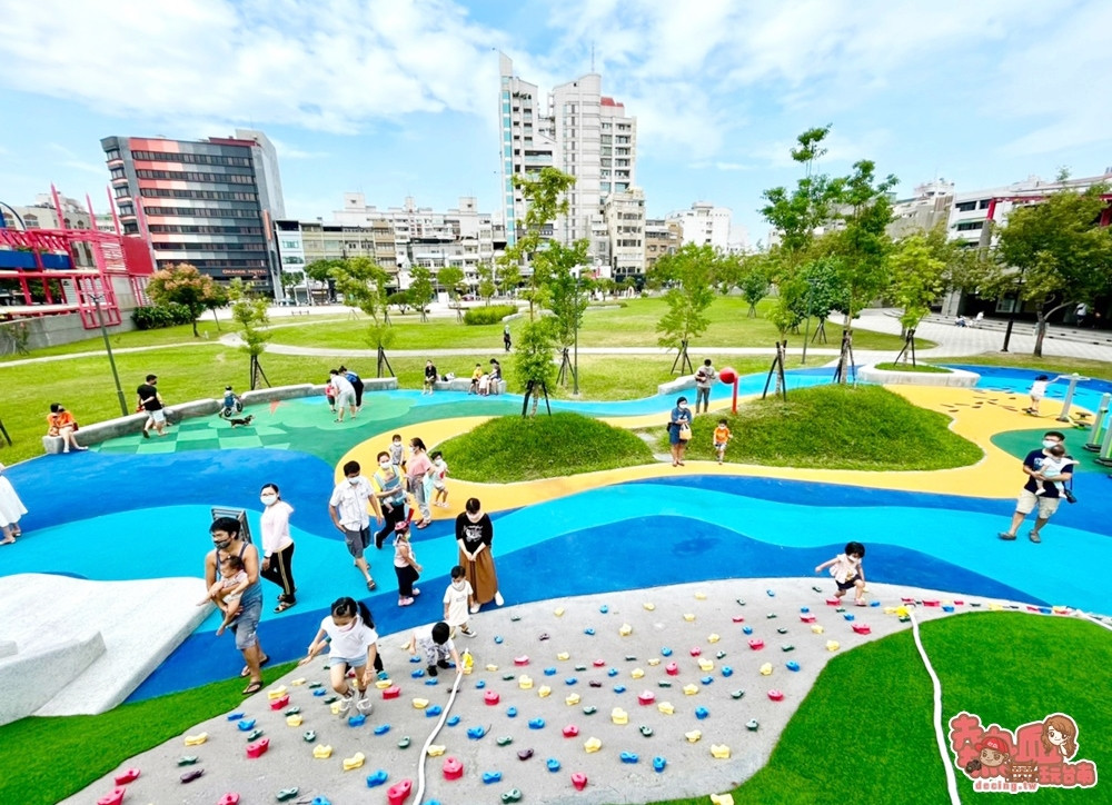 遊戲場舖設森林風軟墊,整體變的明亮起來,其它還有單槓、傳聲筒以及體健設施。草地區可帶泡泡水及球類玩具來,目前公園樹還不夠大,待未來樹蔭茂盛時,還可在樹下野餐享受愜意的休閒時光。