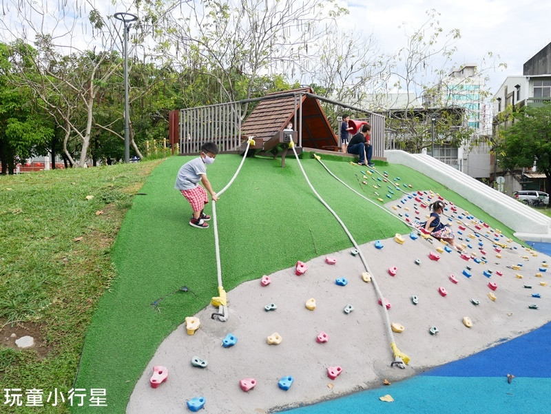遊戲場結合山坡地形,打造嘉義首座攀岩牆,一旁還有繩索攀爬,訓練小朋友手腳協調。