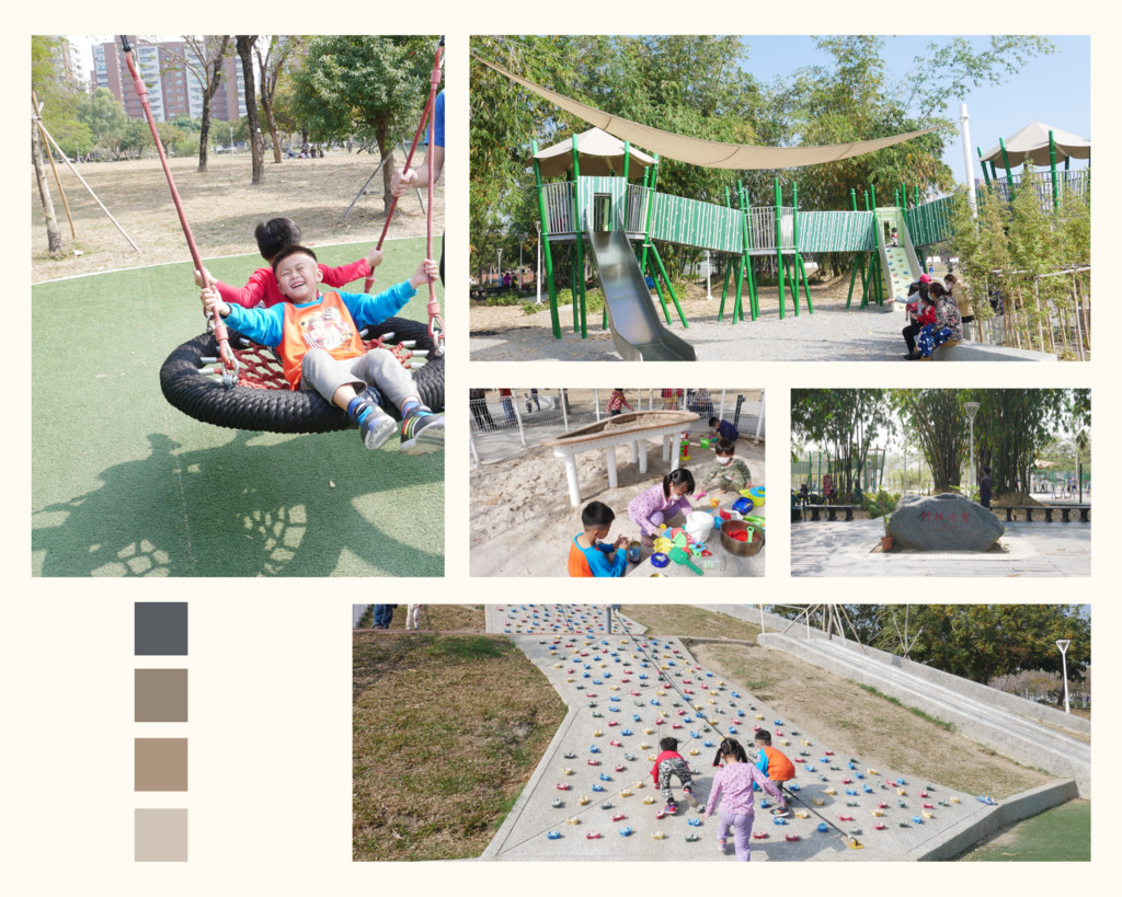 穿梭林間特色遊戲場是2022/01/21完工的,主題遊具是一座仿竹子架構的溜滑梯攀爬設施,小朋友像似在竹林裡穿梭遊玩;其它還有山丘攀岩牆、高低2座磨石子溜滑梯、高雄首座環形溜索、多人旋轉盤、細白沙坑與沙桌、單片/尿布/鳥巢/雙人鞦韆等。沙坑區有用柵欄圍住並提供洗手區,遊戲場間種植不少竹子,仿佛穿梭在竹林迷宮裡,呼應遊戲主題。
