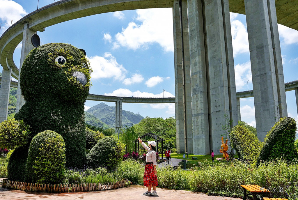 綠雕園區內最吸引小朋友的就是由植物雕塑出的動物造型,有毛毛蟲、貓咪、小狗、鹿、烏龜、山豬、蝴蝶、台灣黑熊,且有的綠雕超巨大,跟著上方高架橋一起拍很有趣。裡面還有一個小型溜滑梯攀岩牆可以玩,園區是免費參觀的,安排遊程行經國姓交流道時,不妨停下來讓小朋友走走拍照趣。