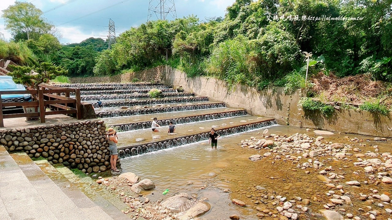 這裡的戲水範圍還滿寬敞的,且旁邊有階梯、大石塊方便大家坐著泡腳,小朋友則忙著踩水找小魚蝦。溪流前段因應高低落差,設計階梯式跌水工法,一層一層的階梯形成多道水瀑,因而有千層瀑布之稱,看著水流一層層的流下來還挺漂亮的,每層之間也很適合小朋友玩水。