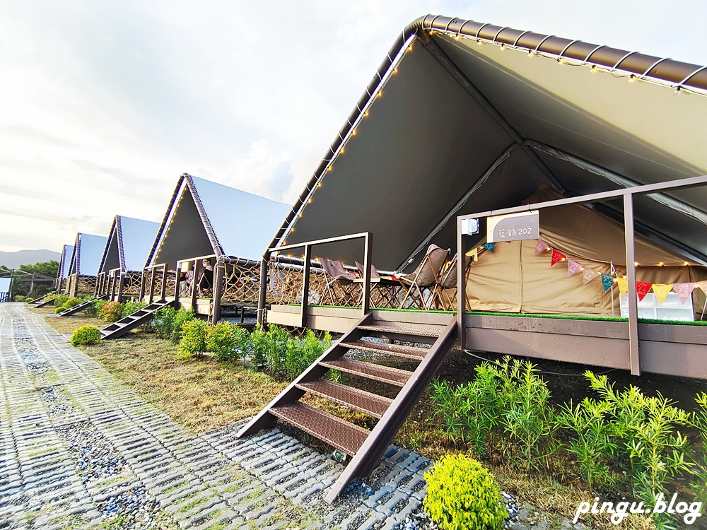 這裡每個帳篷都設置在獨立架高的棧板上,帳與帳之間保有一定的間距,帳篷上有架高的三角雨棚,並設計草皮客廳空間,就算下雨一家人也擁有悠閒的活動空間。營本部提供射箭、廚房組等玩具,度假村內也有簡易山訓設施讓小朋友玩,且營區還有設計尋寶關卡,完成關卡挑戰可以得到小獎品,小朋友露這裡不怕無聊呢。