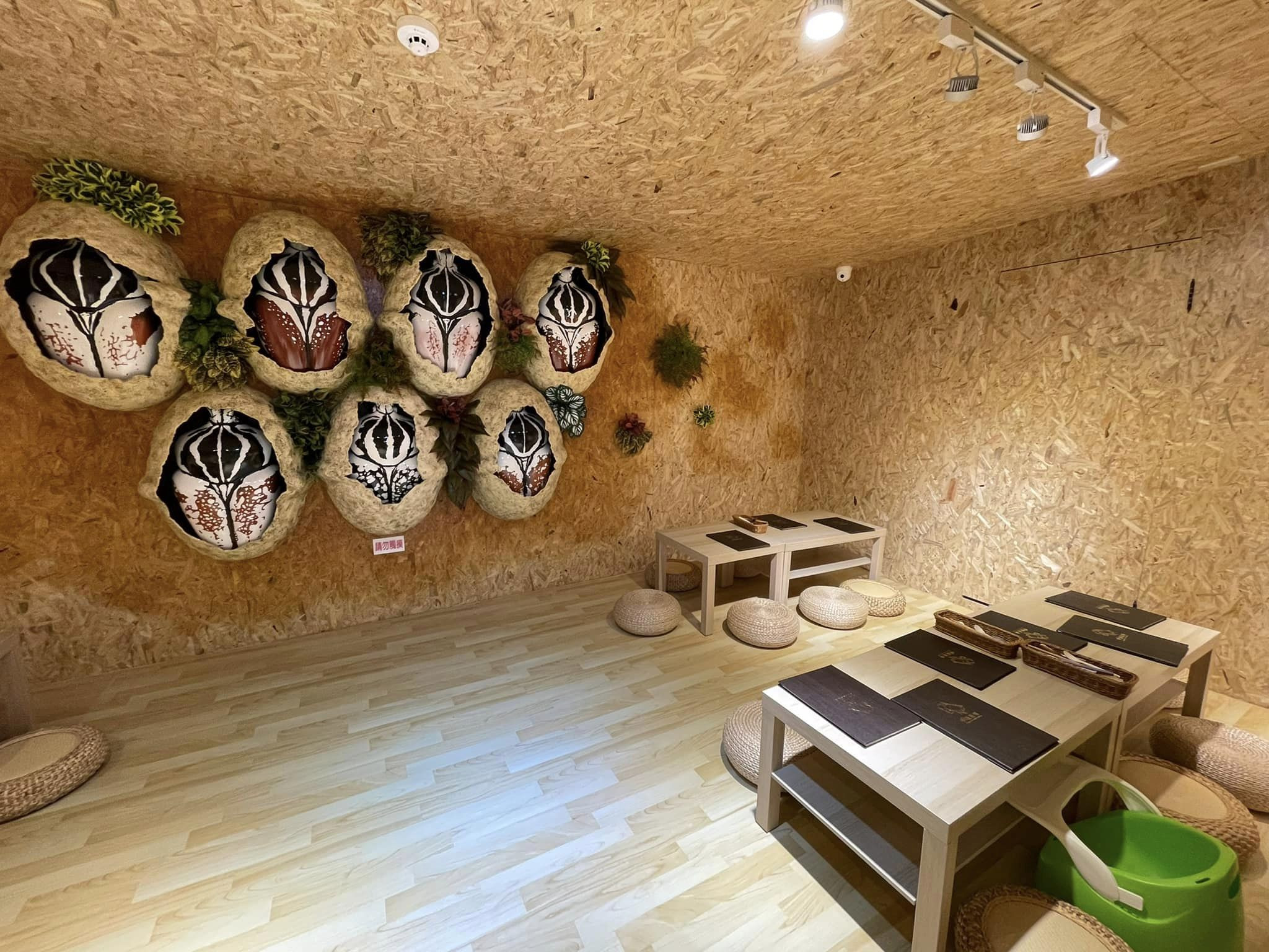 餐廳外爬著一隻巨大的鍬形蟲超吸睛,走進餐廳還有大型獨角仙等甲蟲迎接大小朋友,一旁展示櫃有甲蟲活體可以觀賞,以及販售甲蟲布偶等周邊商品。用餐區採和式設計,很適合小朋友,裡面也利用放大版甲蟲做裝飾,加上綠色植栽,好像走入巨人版甲蟲森林,其中在土繭裡的大王花金龜也很好拍。