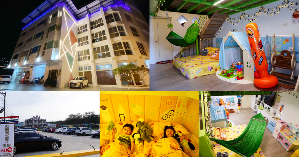 民宿有雙人、三人、四人、五人及六人房型,有幾間為樓中樓房型設計,對小朋友來說好像多了個秘密基地一下。親子房內各有不造型的溜滑梯,另外每房依配置還有提供迷你球池、廚房組、滑步車、彈跳床、跳跳馬等遊具,且大部份的房間內都有小朋友愛的泡澡浴缸。