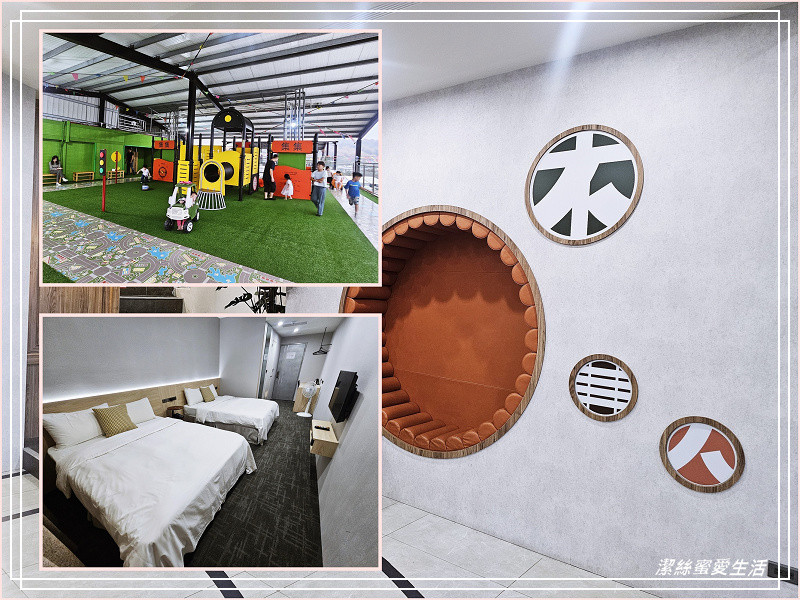 火車主題兒童遊戲場在飯店頂樓,半戶外空間既通風又不會曬到太陽,遊戲場使用人工草皮舖面,有一座火車造型溜滑梯遊戲組,周邊圍繞著小車道,並提供幼兒滑步車給小朋友玩。飯店周邊還有軍史公園、集集火車站、綠色隧道等景點,若週二、六入住,還有集集夜市可以逛。