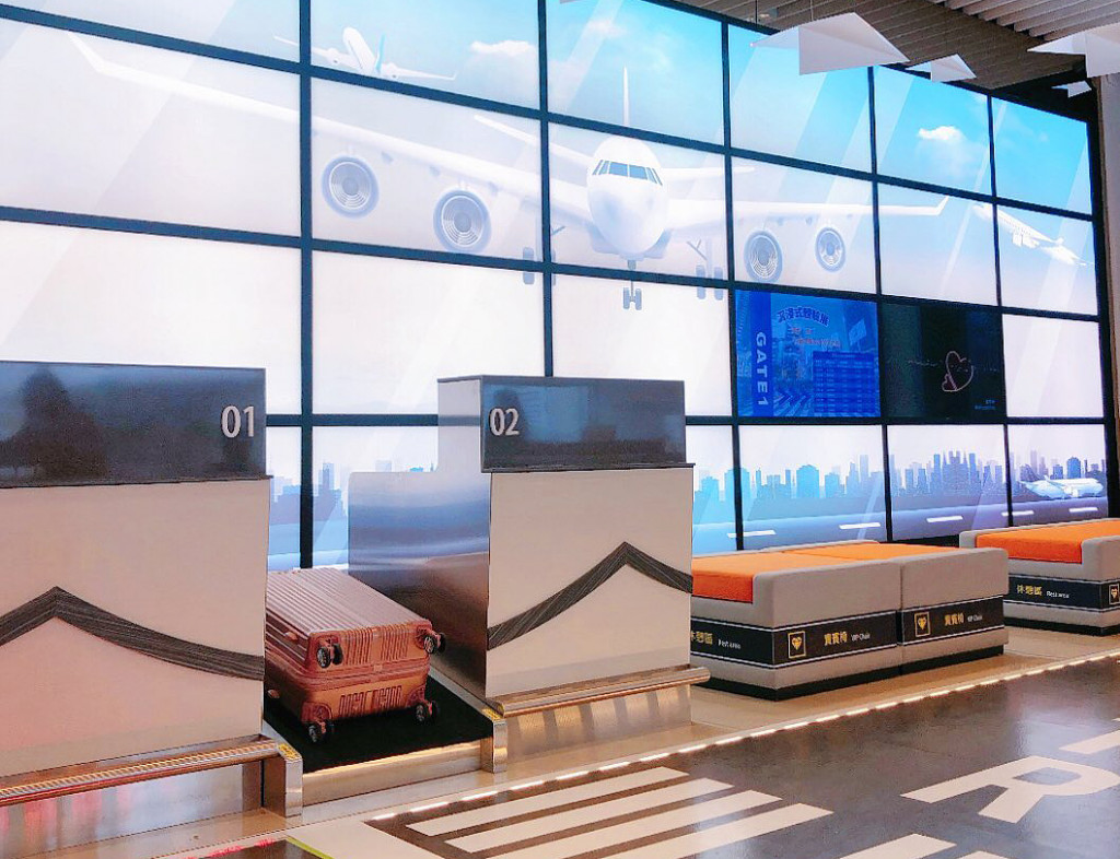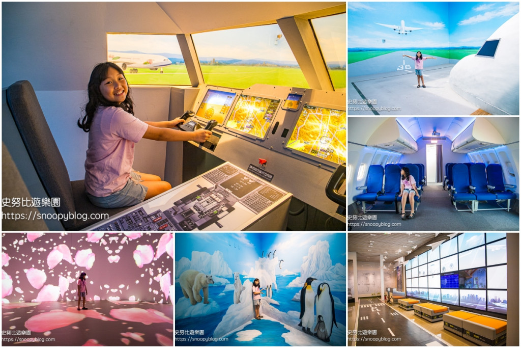 走入特色飛航館,好像來到出境大廳,出境櫃台、行李箱、候機椅等佈置的很真實,後方則是大大的飛機降落彩繪牆,讓人心都跟著飛出去了。館內分為3大主題,有仿真的737客機座艙、機長控制室、3D彩繪牆、飛機模型展示、沈浸式光影劇場等。