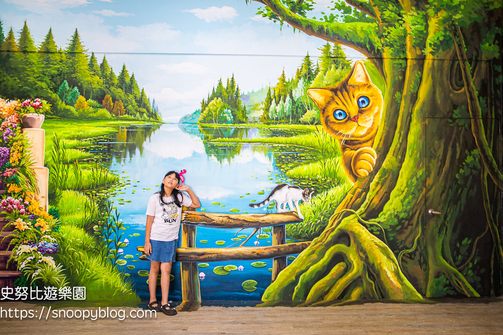 入口大門旁就可以看到巨大的狗狗與貓貓彩繪,室內空間每面牆壁也都彩繪上貓咪主題圖案,有森林湖泊、歐風長廊、鄉間小屋、浪漫紫色雨景等,只要站在適當的位置,取好景,就能拍出一系列特色照片。