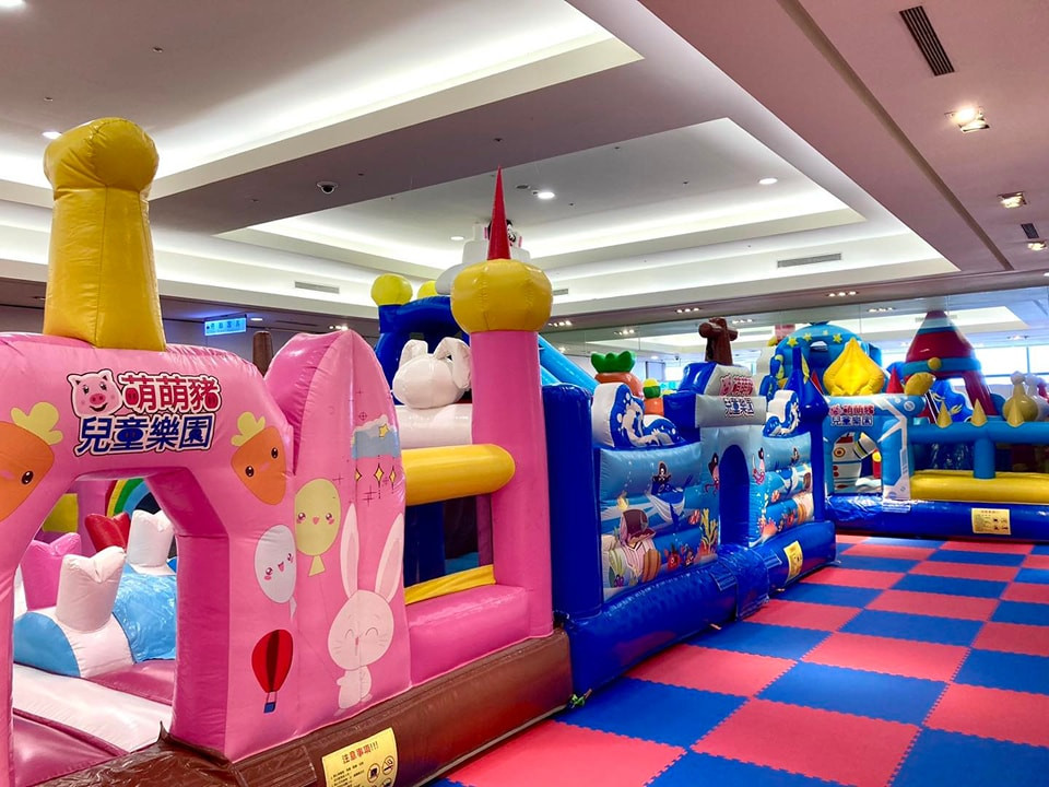 這次氣墊設計以可愛小白兔為主題,全新氣墊有遊樂園、胡桃鉗、太空歷險、海盜船、開心農場,小朋友來玩溜滑梯、彈跳、障礙闖關外,還可以看到小白兔、紅蘿蔔、粉紅豬、兔兔船長、大章魚、宇宙兔兔人,造型逗趣又可愛。
