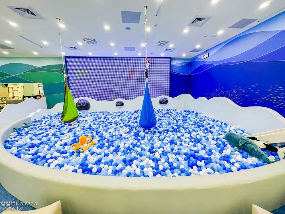 其它有可攀爬跳躍的體能活動區;穿上海洋生物服裝,互動攝影的夢想舞台AR互動區;供應紙筆等美勞工具的創意工作坊;可扮家家酒的廚具組及閱讀區;多樣益智教具的玩具王國;寶寶爬爬遊戲區,另外還貼心設置用餐區與溫暖小窩,小朋友玩累了想睡覺,也有個舒適的地方可以安撫。