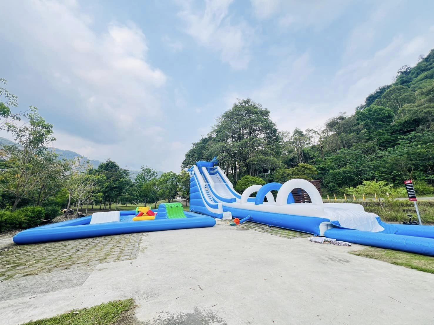 活動現場架設起一座大型溜滑梯滑水道,超過一層樓高的滑水道,順著水流滑下去超刺激!一旁還有一座較低淺的戲水池,適合小朋友玩,且上方擺放3-4座充氣攀爬闖關設施,可以讓小朋友泡水消暑的同時還能消耗體力。
