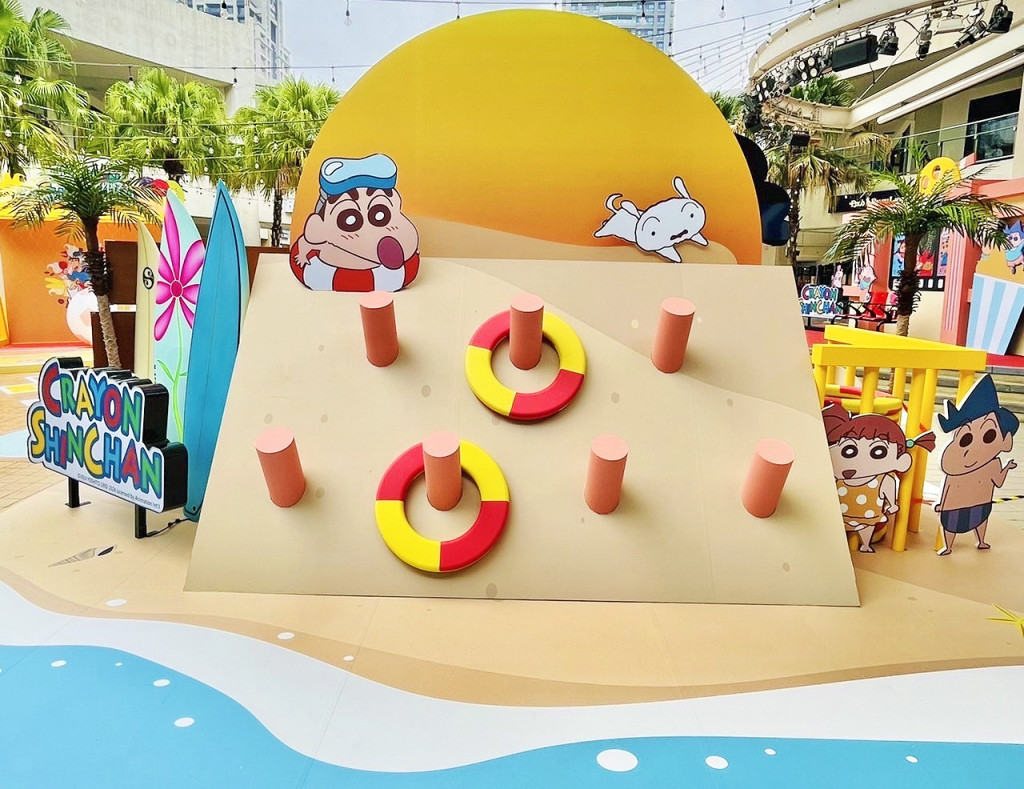 1樓戶外中央廣場化身為野原一家的遊戲區,打造力量測試機、足球踢踢樂、動感套圈圈、華麗劇院、光榮頒獎台共5座主題造景,小朋友可以拿起大型套圈圈來玩;巨大足球能一踢進網嗎?快來跟著小新、妮妮、阿呆、小葵、正男、小白、肥嘟嘟左衛門等人氣角色一起拍出可愛又逗趣的照片。