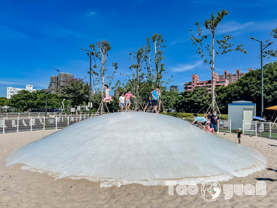 桃園首座雲朵彈跳床,2024/06/28在南崁溪第一河濱公園開FUN遊玩!佔地1.1公頃的河濱公園,經過改造,設計緩和遊戲、體健設施、森林冒險、水道與沙坑等全齡遊戲場,讓大小朋友開心玩。