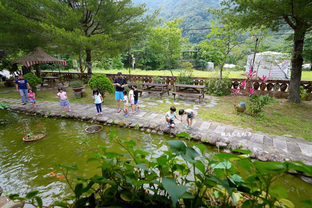 餐廳本身是一棟紅瓦紅磚的建築,古色古香,戶外有座半環繞著建築的魚池,池子底下養了許多魚兒,只要帶上飼料來,就可以讓小朋友餵上一陣子,一旁還有貼心設置幾張桌椅,方便陪伴的家長休息。