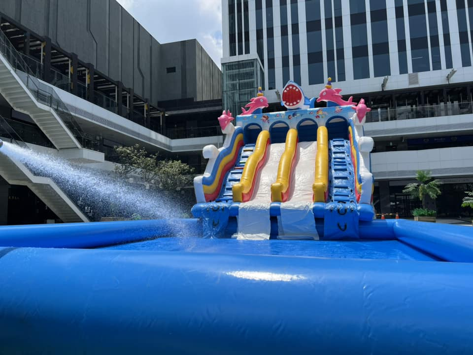 活動場地位在1F中庭,入場遊玩不限時,巨型鯊魚溜滑梯很吸睛,2座波浪滑梯快又刺激,下方水池裡還有擺放泡泡足球、烏龜、恐龍等充氣造型泳具與彩色小球,讓小朋友樂開懷;針對小小孩還有小型戲水池可以玩哦。