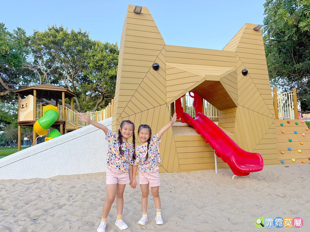 整新後的遊戲場氣氛變的好歡樂,狗狗造型溜滑梯遠遠就吸引小朋友的注意,大狗狗的舌頭是溜滑梯,後方身體結合鑽籠、爬網、爬梯等關卡,其它還有旋轉溜滑梯、寬滑道磨石子溜滑梯,下方沙坑舖面還能滿足小朋友的玩沙樂趣。