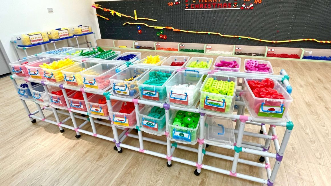 草漯親子館位在草漯多功能館2樓,館內舖設木質地板,開放式空間讓爸媽可輕鬆看顧小朋友;這裡最特別的就是STEAM建構學習區,成排的收納箱裡擺放各式建構式積木,可以搭建成一台車車、房子、軌道組、齒輪連動,小朋友可以盡情發揮創意,建構自己世界的物品。
