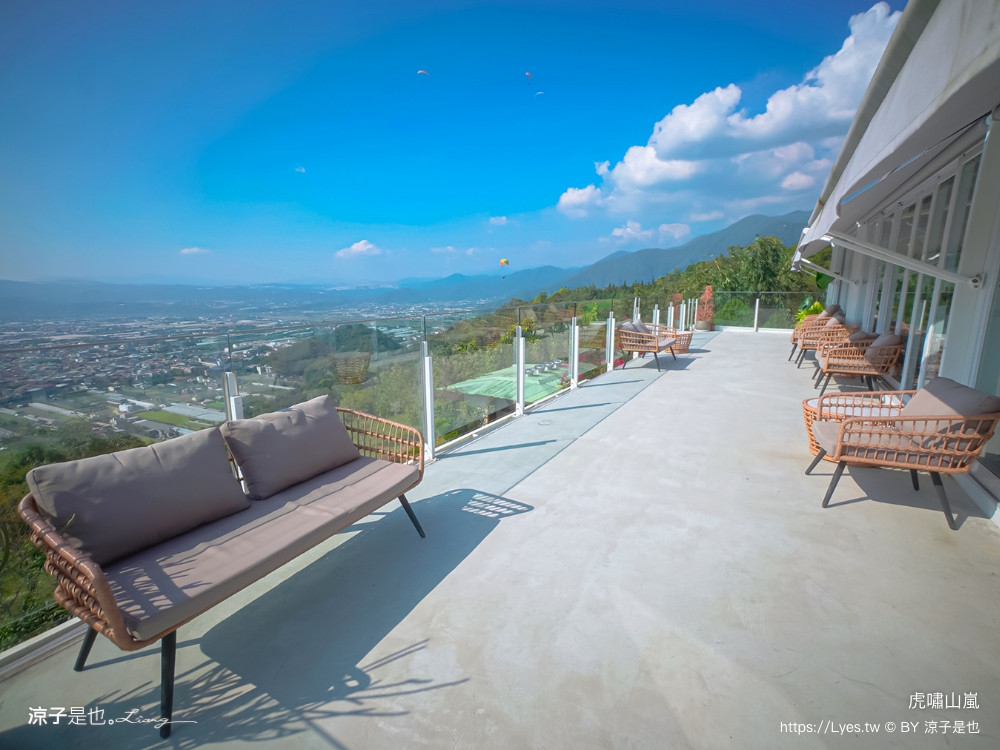 虎嘯山嵐位在南投埔里虎頭山上,店家擁有絕佳的景觀視野,南投市景就在眼前,開闊的景色讓人心曠神怡;園區有大片草坡、兒童遊戲設施、餐廳供應餐點,也有提供飛行傘體驗。