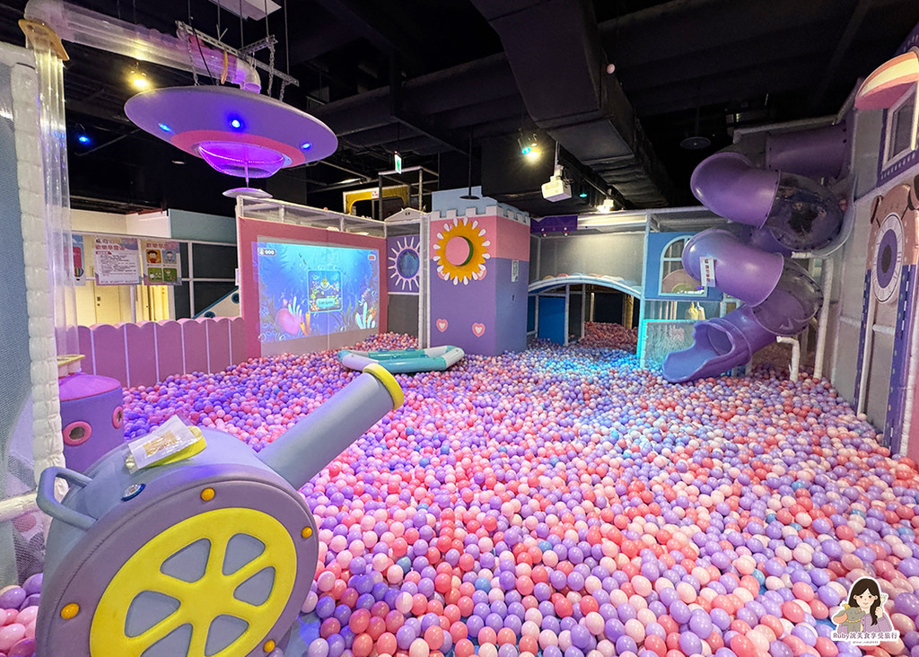 奇幻城堡在桃園環球A19 5樓,小朋友入場直衝球池區,大片球池海讓你盡情遊戲翻滾,裡面有不同造型溜滑梯、障礙迷宮、橡皮艇、互動投影遊戲、吸球機、彩球瀑布等;同樣可以耗電力的還有大型蹦床區,小朋友蹦蹦跳不停,一旁海綿池也有互動遊戲可以玩。