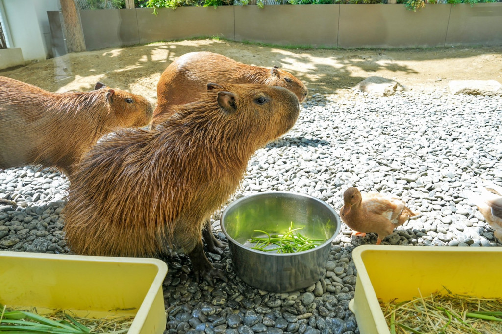 水豚就養在店家後院露天空間,有4隻水豚,還有柯爾鴨與陸龜等小動物;只要消費滿200元,就可進出一次跟水豚互動哦。(這裡空間比較小,假日前往建議先線上取號候位,可以節省等候時間,外帶不需取號)