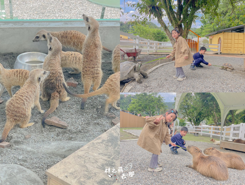 園區內分為2個區域,入園先看到的是貨櫃屋區,裡面可以點餐、有座位可以用餐,周邊也有設置雨篷休憩區,中間玻璃圍欄裡養了10隻小孤獴,看著牠們活潑的模樣,真是可愛。另一區空間更大,開放式區域設置石子步道、小山丘草皮區,動物們悠閒的在裡面散步,大小朋友可以拿牧草與牠們互動餵食。