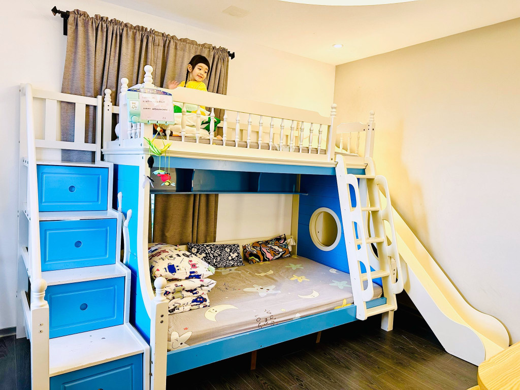 民宿純白建築與遠方海景相呼應,房間採用米白與木質裝潢,清爽潔淨,若是入住海景房,在房內就能欣賞無邊際海景;溜滑梯親子房有18坪大,配置1大床與上下舖溜滑梯床,睡上舖的小朋友起床直接溜下來超開心,房內還有擺放車車造型小帳篷,並提供繪本、益智教玩具給小朋友玩,房內還有泡澡浴缸哦。