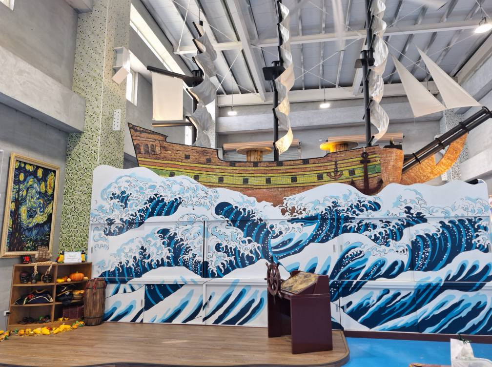 農場座落在田園之間,整棟建築物由上萬片馬賽克裝飾成歐式風情,繽紛圖案非常亮眼,在未開放前就吸引不少遊客前往拍照;走進裡面還有更多造景巧思與裝置藝術,讓人驚嘆,室內還有一座馬賽克拼貼而成大帆船,每個角落都很好拍。
