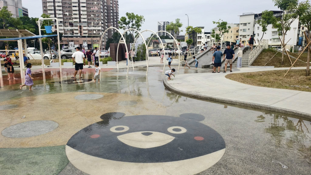 專為玩水而打造的公園,水池約15公分,小小孩安心玩;裡面設計噴水隧道、大水桶、樹葉、噴水槍等造型花灑,最旁邊還有寬、窄滑道磨石子溜滑梯,小朋友最愛一口氣滑到水裡,遊樂+玩水一次滿足!且遊戲場地面繪上Q版台灣黑熊圖案,拍起來也很可愛。