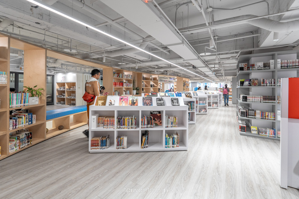 館內空間設計相較一般圖書館更顯青春活動,流線書櫃加上彩色沙發座椅,很有設計感;這裡最吸引小朋友的就是有超多漫畫,也有不少新書,加上舒適的閱讀環境,可以看上一陣子;這裡也有包廂式影音區,可以租借館內影片觀看,另外小朋友也有積木與互動電視牆可以玩哦。