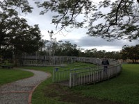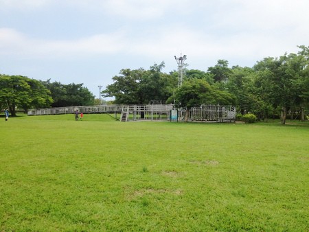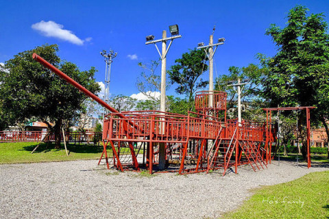 公園裡的草地佔地有2公頃,可以在草地上放風箏、踢球、野餐,旁邊還有一個老火車頭,還可以讓小朋友爬上去參觀體驗,此外還有大型的鐵網式的體能設施,適合幼稚園大班以上的小朋友來挑戰。
