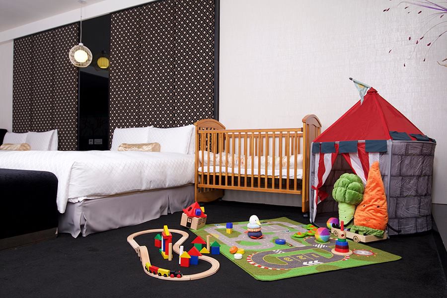 悅棧酒店設有22坪~30坪的親子房,每間親子房都有提供手工餅乾、遊戲帳篷、絨布娃娃、積木組、疊疊樂及小木車和軌道組等玩具,讓小朋友在房間有得吃又有得玩。酒店也貼心提供多樣嬰兒備品,如:奶瓶消毒鍋、寶貝沐浴澡盆、彼得兔娃娃床和寢具、小腳凳、迷你馬桶座墊、學習小馬桶、專屬兒童牙刷+牙膏等,甚至推車也免費提供使用。