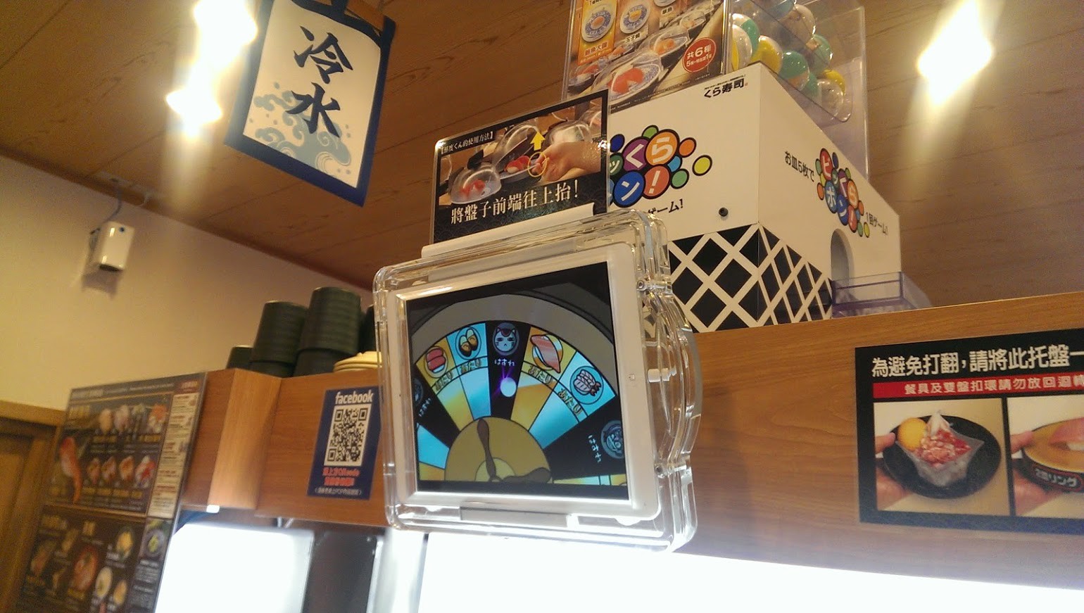 另一個有趣的特色是用完餐的餐盤,可以投入每個桌旁的遊戲機內,每5個餐盤可以玩一次扭蛋的中獎遊戲,會有可愛的動畫,中獎後還會送小玩具,每個小朋友為了得到玩遊戲的機會,都多吃好幾盤壽司呢。