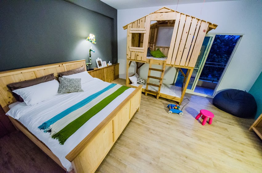 窩久久的設計師的專長是設計樹屋,其大量採用木頭裝潢和實木傢俱,而四種北歐風精緻房型皆有陽台。帶小朋友來住樹屋親子套房,看小朋友爬上爬下,非常開心。