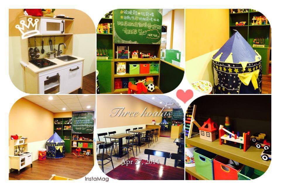 餐廳分2個店面,主餐廳為Three Koalas,隔壁的Next Door則為附屬的親子餐廳。餐廳內部為細長型,用餐區不大,最裡面用木地板隔出一區遊戲區,有積木、軌道火車組、小廚房、小帳篷...等玩具,還有一片黑板牆讓小朋友塗鴨。