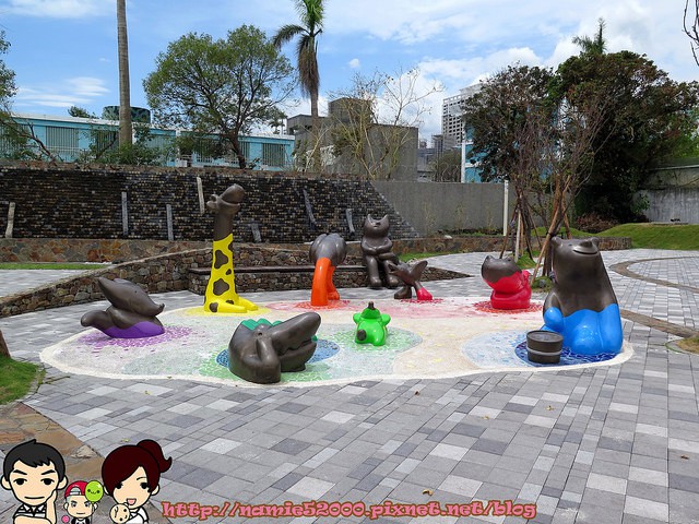 在公園中央有座仿的小池子,有長頸鹿、熊、狐狸、老鼠、駝鳥、河馬、鱷魚、鴨子,還有一隻怕水的貓咪孤單的坐在一旁。每隻泡湯動物身上的顏色都是有故事的,跟小朋友一起來瞭解一下吧。
