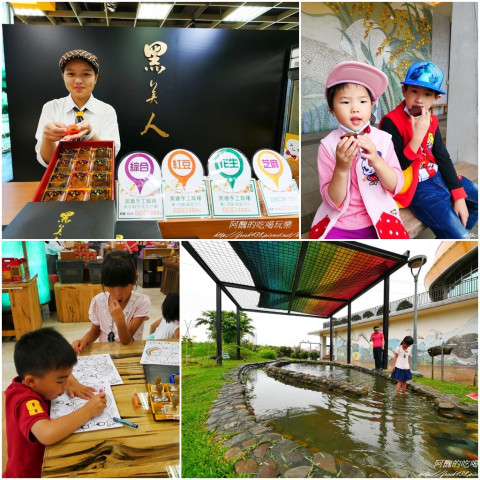 品牌故事區有影片與一些復古擺設,一旁有個大石臼讓遊客體驗搗麻糬;一樓戶外還有一大區的景觀休息區,大片草地適合小孩跑跳,園區還設置了7座彩色冷泉泡腳池與一座大的冷泉戲水池,泡腳池是利用幫浦將冷泉打上,小朋友可以玩很久呢。這裡假日不定時舉辦魔術表演與音樂表演,很熱鬧。