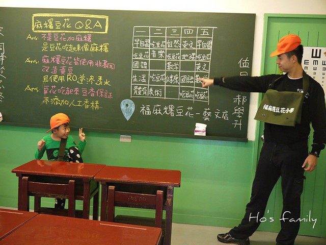 這裡一樣提供免費的小學生制服、帽子和書包,用餐的客人可以打扮成小學生的模樣來拍照或吃豆花。黑板上的課表,值日生...等都好讓人懷念,連爸媽也開心拍照呢。