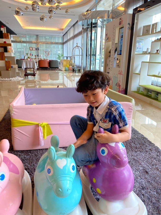 飯店在一樓大廳也有設置一個兒童遊戲區,遊戲區準備了Rody跳跳馬、蝸牛吧噗等,在爸媽辦理入住時,小朋友可以在這裡玩一下打發時間。